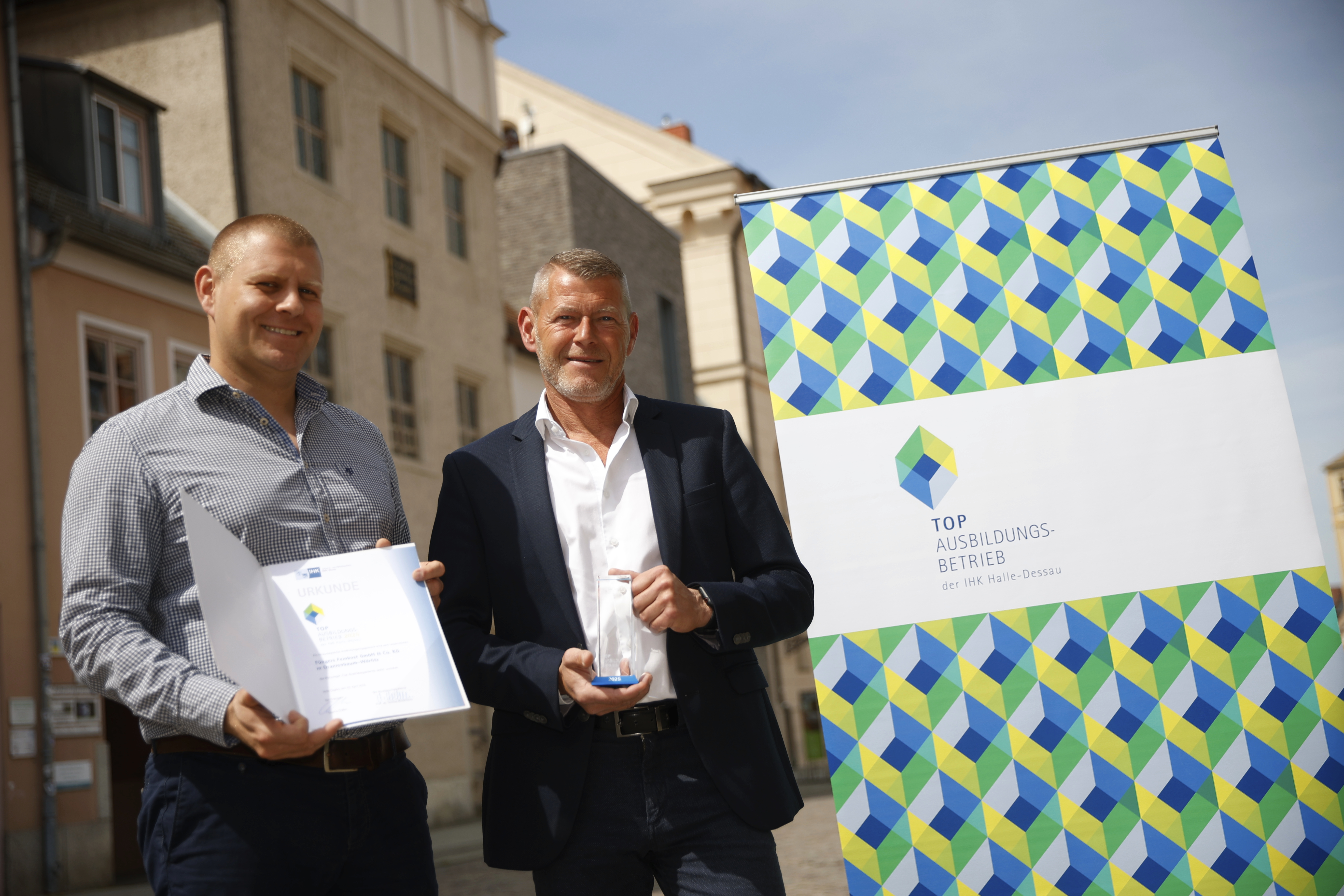 Am 14. Mai 2025 durften wir in feierlichem Rahmen eine ganz besondere Ehrung entgegennehmen: Die Industrie- und Handelskammer Halle-Dessau (IHK) zeichnete uns erneut als "Top-Ausbildungsbetrieb" aus. Gemeinsam mit unserem Geschäftsführer Herr Weigel, nahm Herr Fricke als Ausbildungsverantwortlicher für den technischen Bereich, die diesjährige Auszeichnung im Rahmen einer Pressekonferenz in Wittenberg entgegen. Im Vorfeld wurden rund 2.200 aktive Ausbildungsunternehmen aus dem südlichen Sachsen-Anhalt aufgerufen, sich um das Gütesiegel zu bewerben. Eine Jury der IHK hat alle Bewerbungen eingehend geprüft und konnte die Auszeichnung an insgesamt 22 Unternehmen vergeben.