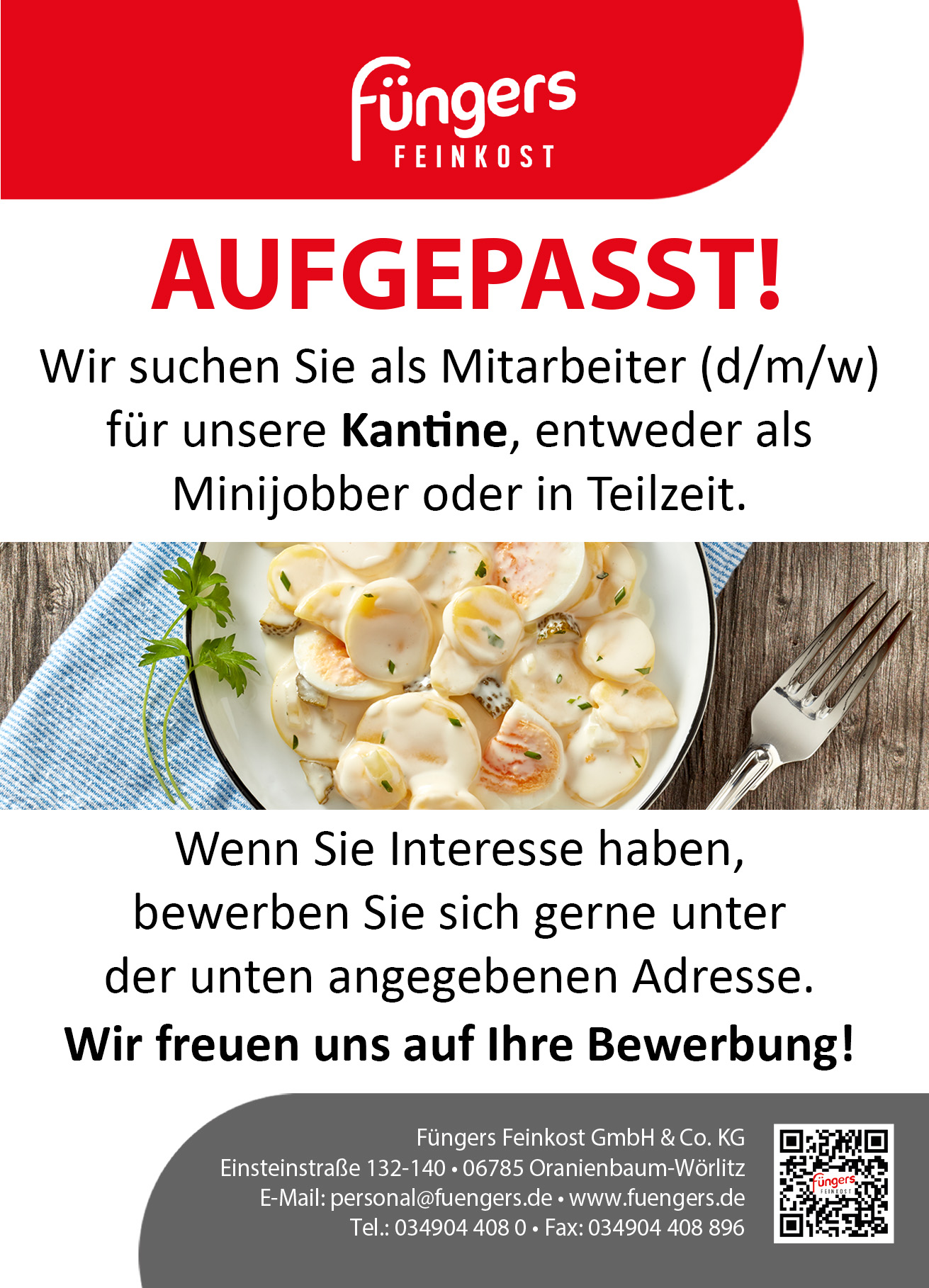 Wer bei Füngers Feinkost gelernt hat, kann gerne gleich da bleiben. Denn bei unseren Azubis wissen wir, dass sie eine hochwertige, vielseitige Ausbildung genossen haben. Du hast Lust, auf eine spannende Karriere bei einem der Branchenführer?